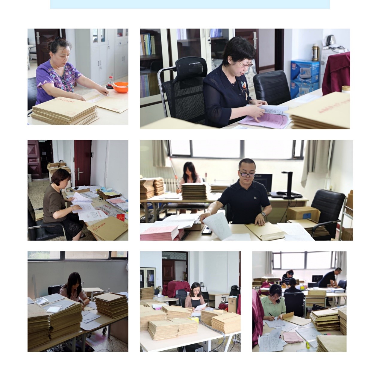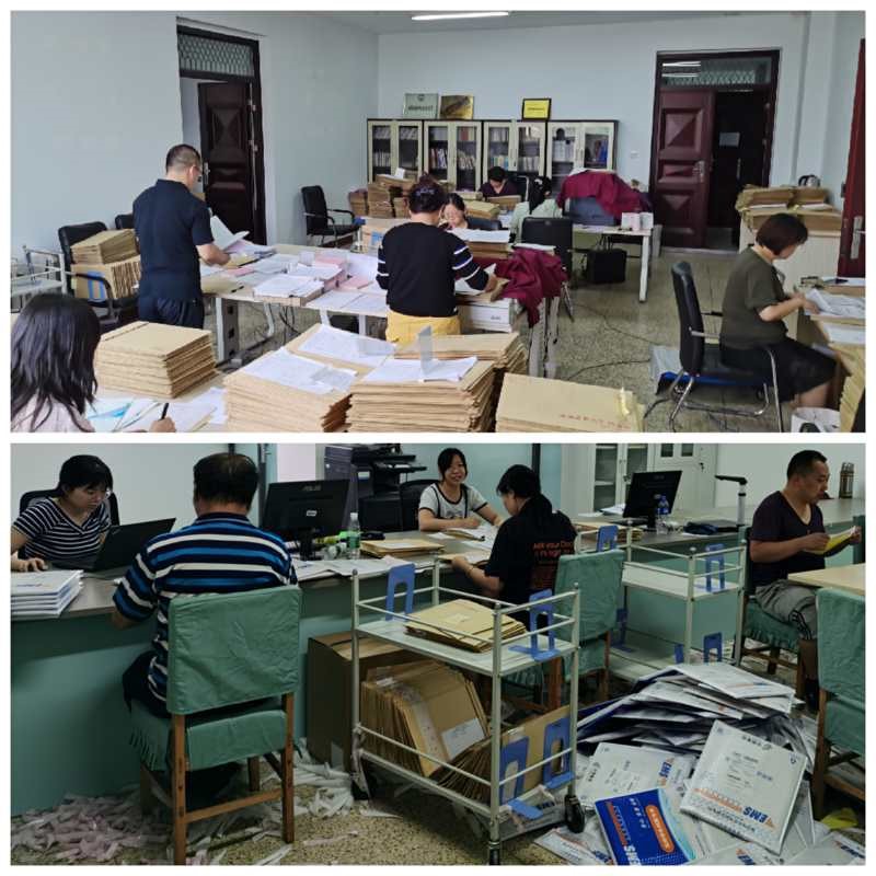畢業(yè)生檔案工作是一項(xiàng)需要極致認(rèn)真的工作,萬無一失始終是我們踐行的工作標(biāo)準(zhǔn)。從接收到轉(zhuǎn)遞,每名畢業(yè)生檔案的整理都有十幾個(gè)環(huán)節(jié),全部畢業(yè)生檔案的整理背后則是幾萬次的細(xì)致審核。按照分工,館內(nèi)老師人均負(fù)責(zé)近700名畢業(yè)生的檔案整理,也就是意味著每位老師都要接收、審核、歸檔、登記上萬份的材料,進(jìn)行二次復(fù)核后,再粘貼近700個(gè)封條,蓋1400多個(gè)密封章,核對近700條轉(zhuǎn)寄地址,建立數(shù)據(jù)庫,檔案轉(zhuǎn)遞后確保帳檔相符。如此繁雜的工作量,每位老師都要付出極大的細(xì)心、耐心和責(zé)任心。無論是即將退休的老同志,還是家中有2歲孩子牽掛的年輕人,館內(nèi)全體人員為了保證工作進(jìn)度,克服兩校區(qū)通勤和個(gè)人困難,有早上5點(diǎn)到崗的,有晚上11點(diǎn)回家的,吃飯常常是匆匆盒飯,甚至來不及吃,同心協(xié)力、分工協(xié)作,終于在7月10日順利完成了4734名畢業(yè)生檔案的整理工作,及時(shí)轉(zhuǎn)遞了2607名畢業(yè)生的檔案。