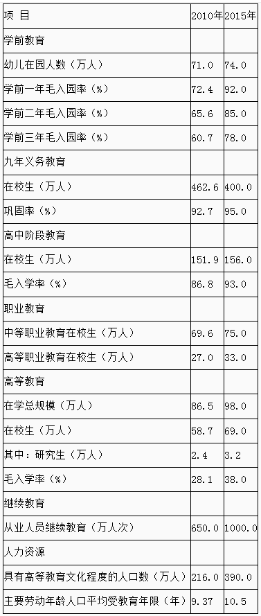 ——加快發展繼續教育,推進全民學習、終身學習和學習型社會建設。完成從業人員培訓1000萬人次;主要勞動年齡人口平均受教育年限達10.5年以上。