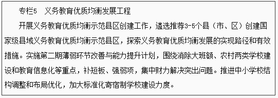 ——義務(wù)教育優(yōu)質(zhì)均衡發(fā)展邁上新臺階。義務(wù)教育學(xué)校辦學(xué)條件全部達(dá)到國家底線要求和省定辦學(xué)標(biāo)準(zhǔn),縣域內(nèi)城鄉(xiāng)義務(wù)教育一體化發(fā)展,力爭通過國家義務(wù)教育優(yōu)質(zhì)均衡發(fā)展督導(dǎo)評估認(rèn)定的縣(市、區(qū))達(dá)到20%以上。