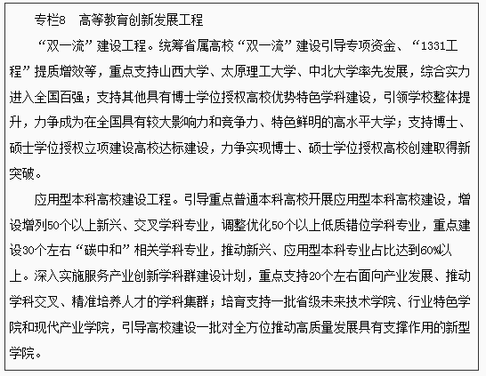 加大高等教育統(tǒng)籌發(fā)展力度,完善分類發(fā)展體系,推動高校辦學(xué)定位更加合理、辦學(xué)特色更加鮮明、優(yōu)勢資源更加集聚、創(chuàng)新生態(tài)更加優(yōu)化、人才培養(yǎng)更加精準(zhǔn)。加快推動“雙一流”建設(shè)高校內(nèi)涵式高質(zhì)量發(fā)展,支持山西大學(xué)、太原理工大學(xué)、中北大學(xué)率先發(fā)展,深入推進(jìn)教育部與省政府戰(zhàn)略合作備忘錄、合建山西大學(xué),省政府與工業(yè)和信息化部共建中北大學(xué),實施“雙一流”種子學(xué)科培育工程,推動“雙一流”建設(shè)取得明顯成效。加強(qiáng)應(yīng)用型本科高校建設(shè),著力構(gòu)建支撐全方位推動高質(zhì)量發(fā)展的應(yīng)用型本科教育體系。支持其他具有博士學(xué)位授權(quán)的高校提升基礎(chǔ)能力,加快優(yōu)勢特色學(xué)科建設(shè),力爭成為在全國或行業(yè)具有較大影響力的研究應(yīng)用型大學(xué);推進(jìn)未獲得博士學(xué)位授權(quán)的普通本科高校面向行業(yè)產(chǎn)業(yè)發(fā)展需求,全面建設(shè)高水平應(yīng)用型本科高校,推動教育鏈、人才鏈與產(chǎn)業(yè)鏈、創(chuàng)新鏈深度耦合。