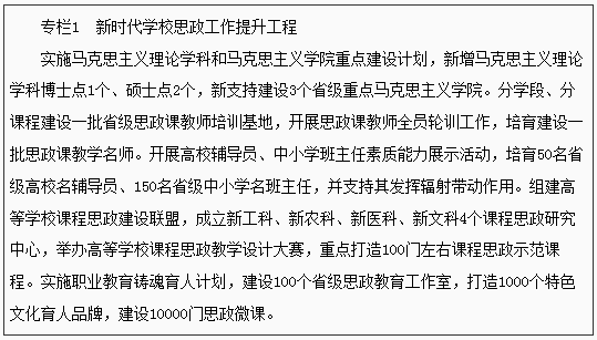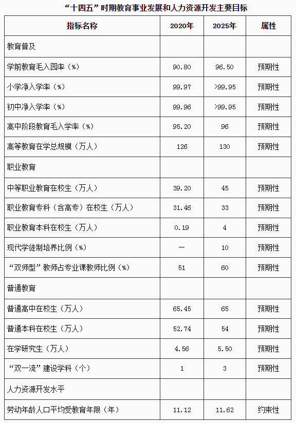 ——職業(yè)教育改革取得實質(zhì)性突破。政府統(tǒng)籌管理、行業(yè)企業(yè)積極舉辦、社會力量深度參與的多元辦學(xué)格局基本形成。學(xué)歷教育與職業(yè)培訓(xùn)并舉并重,不同層次職業(yè)教育縱向有效貫通,不同類型教育橫向全面融通。4所國家“雙高計劃”高職院校完成建設(shè)任務(wù),建設(shè)10所省級“雙高計劃”高職院:50所省級高水平中等職業(yè)學(xué)校。
