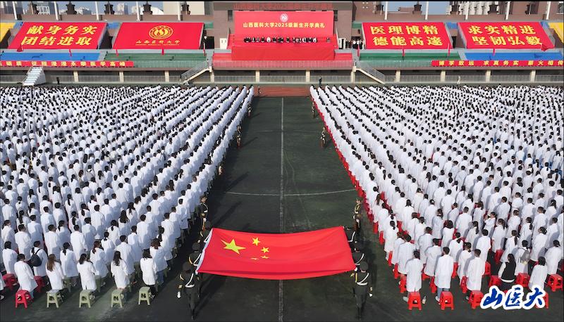 9月14日上午,我校2025級(jí)新生開學(xué)典禮在中都校區(qū)風(fēng)雨操場(chǎng)舉行。來自五湖四海的6225名新同學(xué)匯聚山醫(yī),展現(xiàn)蓬勃朝氣,昂揚(yáng)青春自信,共同迎接學(xué)業(yè)生涯的新起點(diǎn)。晉中市政府副市長張擁軍,清華大學(xué)長聘教授、基礎(chǔ)醫(yī)學(xué)院院長李海濤,華大集團(tuán)相關(guān)專家,我校黨委書記王軍,校長解軍,校黨委副書記彭月蘭,省紀(jì)委監(jiān)委駐校紀(jì)檢監(jiān)察組組長、校黨委常委楊文斌,副校長張巖波,校黨委常委、副校長焦向英、武志芳,第二臨床醫(yī)學(xué)院黨委書記安?。諞渙俅慘窖г焊痹撼な╈陟康?,學(xué)校各職能部門、各培養(yǎng)單位負(fù)責(zé)人,新生思想政治輔導(dǎo)員,以及部分2025級(jí)新生的家長等參加了典禮。