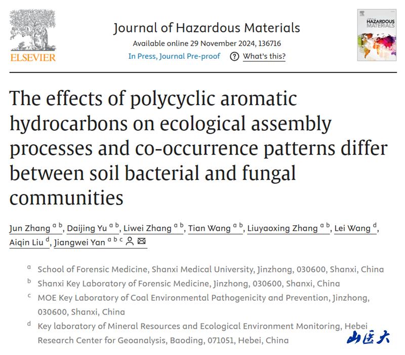 近日,我校嚴江偉教授創新團隊在環境科學權威期刊《Journal of Hazardous Materials》(中國科學院一區,IF=12.2)上發表題為“The effects of polycyclic aromatic hydrocarbons on ecological assembly processes and co-occurrence patterns differ between soil bacterial and fungal communities”的研究論文,成果揭示了多環芳烴污染下土壤微生物群落構建和維持機制,并基于微生物標記物構建了土壤多環芳烴污染?:Τ潭鵲鈉攔撈逑?,表明了微生物作為環境法醫學指示物種在診斷土壤污染?:Τ潭確矯婢哂芯藪笄蹦?,該成果對于土壤污染診斷修復和生態多樣性保護方面具有指導意義。