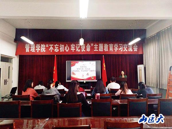 根據學:脫г汗賾凇安煌跣、牢記使命”主題教育安排,9月27日上午,管理學院研究生第一黨支部在中都校區(qū)至善C305召開了“不忘初心、牢記使命”主題教育專題學習交流會。研究生第一黨支部全體黨員出席了會議,支部書記任敏主持會議并帶頭作交流發(fā)言,預備黨員李咪咪、袁璐璐、薛雅卿、候麗紅、張佳瑩分別暢談交流學習體會和收獲。