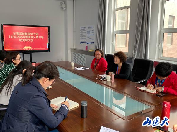 10月9日上午,護理學院在中都校區至真樓311開展《習近平談治國理政》第三卷微黨課學習交流活動;顒佑勺o理學院黨委書記郭華主持,特邀馬克思主義學院直屬黨支部書記、思政課專家董海濤教授蒞臨現場點評指導,針對問題開展理論宣講。學院黨委副書記金姬與各支部書記分別從不同主題以PPT講課的方式交流了自己的學習體會。