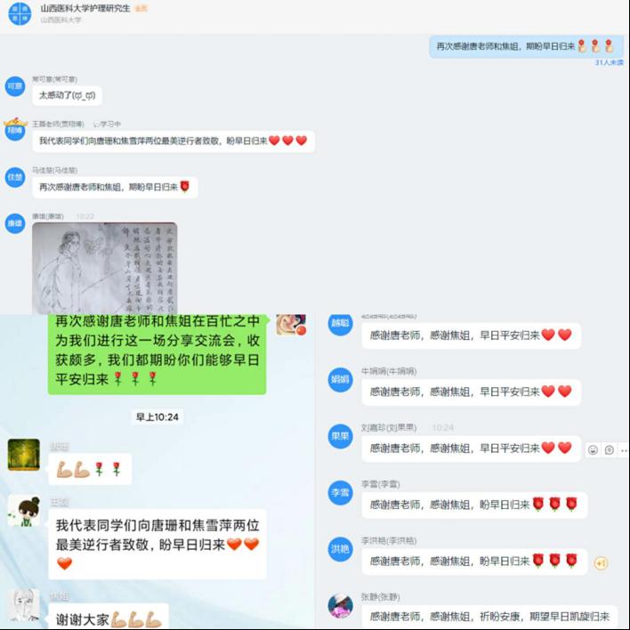 此次主題班會(huì)同學(xué)們受益匪淺,會(huì)議結(jié)束后,輔導(dǎo)員代表同學(xué)們向唐珊老師和焦雪萍兩位最美逆行者致敬,希望他們能夠早日歸來(lái)。同學(xué)們也紛紛為兩位老師發(fā)出祝福,希望他們能夠在防疫的前方做好自身防護(hù),保重身體,我們?cè)诤蠓阶鏊齻儓?jiān)實(shí)的后盾,期盼安康,期待能夠與她們?cè)缛障嗑?,一起學(xué)習(xí),一起工作。當(dāng)君歸來(lái)時(shí),便是花開(kāi)日!希望自己今后能夠立足臨床實(shí)際,踏實(shí)科研步伐,秉承愛(ài)心仁術(shù)的精神內(nèi)涵為護(hù)理事業(yè)奮斗終身,為祖國(guó)貢獻(xiàn)自身力量!