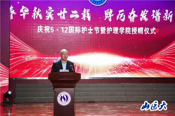 王軍代表全校師生醫護員工向長期以來堅守在護理工作崗位、辛勤耕耘在護理教育一線的同志們致以誠摯的問候和節日的?:?,向廣大護理學子提出了“點亮夢想,踔厲奮發”“甘于奉獻,大愛無疆”“苦練本領,知行合一”的諄諄囑咐,鼓勵大家作為健康中國的生力軍,要兼具博愛之心、精湛技藝和創新精神,在燃燒自己、照亮別人的南丁格爾精神指引下,以勤為徑、以苦作舟,用手中的蠟燭點燃前進的方向,向信仰看齊,向夢想致敬,向未來出發,為書寫健康中國藍圖,做出自己更大的貢獻。