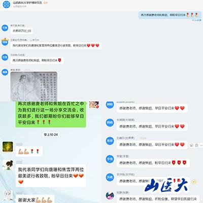 會議結束后,輔導員王磊老師代表同學們向唐珊老師和焦雪萍兩位最美逆行者致敬,希望他們能夠早日平安歸來。同學們也紛紛為兩位老師發出祝福,希望他們能夠在抗疫一線做好自身防護,保重身體,我們在后方做她們堅實的后盾,期待能夠與她們早日相聚。當君歸來時,便是花開日!