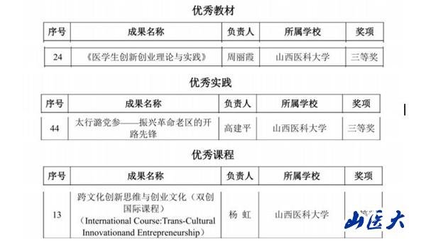 學(xué)校獲評優(yōu)秀組織獎(jiǎng),學(xué)校創(chuàng)新創(chuàng)業(yè)學(xué)院周麗霞副教授、人文學(xué)院呂雪梅講師主編教材《醫(yī)學(xué)生創(chuàng)新創(chuàng)業(yè)理論與實(shí)踐》獲“優(yōu)秀教材”三等獎(jiǎng),藥學(xué)院高建平教授團(tuán)隊(duì)項(xiàng)目太行潞黨參——振興革命老區(qū)的開路先鋒獲優(yōu)秀實(shí)踐三等獎(jiǎng),外語系楊虹講師面向留學(xué)生開設(shè)的國際創(chuàng)新創(chuàng)業(yè)教育課程“跨文化創(chuàng)新思維與創(chuàng)業(yè)文化”(Trans-Cultural Innovation and Entrepreneurship)獲優(yōu)秀課程三等獎(jiǎng)。