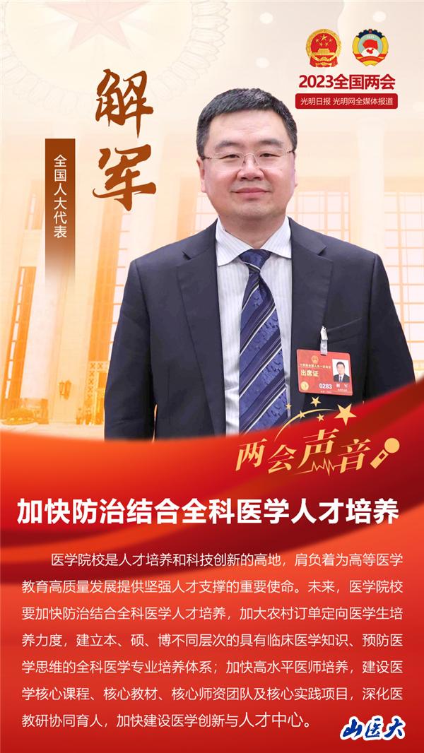 解軍在采訪中表示,醫學院校是人才培養和科技創新的高地,肩負著為高等醫學教育高質量發展提供堅強人才支撐的重要使命。未來,醫學院校要加快防治結合全科醫學人才培養,加大農村訂單定向醫學生培養力度,建立本、碩、博不同層次的具有臨床醫學知識、預防醫學思維的全科醫學專業培養體系;加快高水平醫師培養,建設醫學核心課程、核心教材、核心師資團隊及核心實踐項目,深化醫教研協同育人,加快建設醫學創新與人才中心。