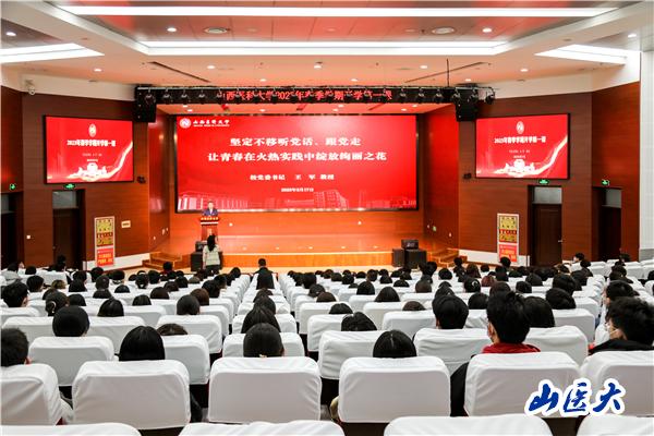 春暖花開萬物新,揚帆奮進正當時。3月17日上午,我校2023年春季學期開學第一課在中都校區教學辦公樓一層報告廳舉行。校黨委書記王軍走近山醫師生,以“堅定不移聽黨話、跟黨走,讓青春在火熱實踐中綻放絢麗之花”為題,為300余名師生代表帶來了一場立意高遠、思想深邃、內涵豐富、感染力強的開學第一課。學生工作部部長張晶主持活動。