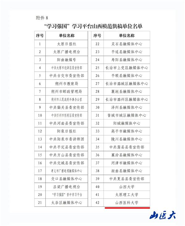 在積極向“學習強國”山西學習平臺投稿的同時,我校在全省率先上線了“c7c7.app”學習強國號,這是展現我校服務“健康山西”建設、努力建成全國一流研究應用型醫科大學的新載體,是傳播山醫精神、講述山醫故事、展示山醫形象的新窗口。學校將以此次表彰為契機,再接再厲,進一步將“學習強國”學習平臺作為深入學習貫徹習近平新時代中國特色社會主義思想和黨的二十大精神、落實立德樹人根本任務的重要陣地,作為加強思想建設、推進理論武裝的重要載體,為建成全國一流研究應用型醫科大學提供堅強思想保證和精神動力。