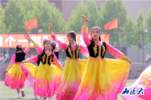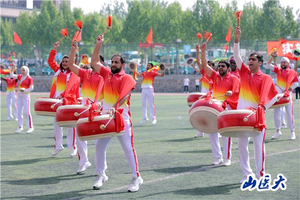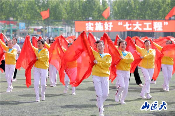 各單位整隊退場后,大型文體展演“走進新時代、奮進新征程”開始。原山西省衛生廳黨組書記、廳長李俊峰等校友代表接力傳遞著象征山醫精神的“奮進之光”,展示著榮耀與傳承。全校各院系參演人員、夕陽紅舞蹈隊、紅石榴工作室、法醫學院啦啦隊、國際教育學院勁風鼓樂團和800余名師生員工的精彩表演將運動會開幕式的氣氛再次推向高潮。