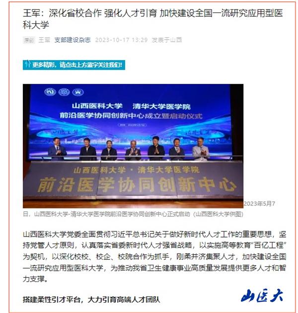 10月17日,山西省重點(diǎn)黨建旬刊《支部建設(shè)》雜志“主題策劃”欄目刊發(fā)我校黨委書(shū)記王軍署名文章《深化省校合作 強(qiáng)化人才引育 加快建設(shè)全國(guó)一流研究應(yīng)用型醫(yī)科大學(xué)》。文章從“搭建柔性引才平臺(tái),大力引育高端人才團(tuán)隊(duì)”“服務(wù)國(guó)家重大戰(zhàn)略,培養(yǎng)高水平公共衛(wèi)生人才”“深化產(chǎn)教研用融合,更好服務(wù)山西轉(zhuǎn)型發(fā)展”“完善激勵(lì)保障機(jī)制,全面優(yōu)化人才發(fā)展生態(tài)”四個(gè)部分,深度闡述了我校黨委全面貫徹習(xí)近平總書(shū)記關(guān)于做好新時(shí)代人才工作的重要思想,堅(jiān)持黨管人才原則,認(rèn)真落實(shí)省委新時(shí)代人才強(qiáng)省戰(zhàn)略,以實(shí)施高等教育百億工程為契機(jī),以深化校校、校企、校院合作為抓手,剛?cè)岵?jì)集聚人才,加快建設(shè)全國(guó)一流研究應(yīng)用型醫(yī)科大學(xué),為推動(dòng)我省衛(wèi)生健康事業(yè)高質(zhì)量發(fā)展提供更多的人才和智力支撐。