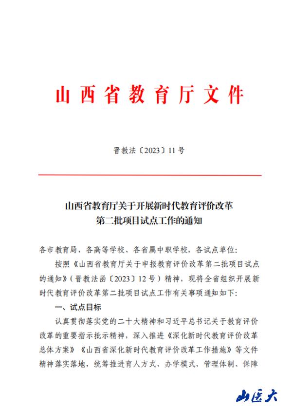 山西省新時(shí)代教育評(píng)價(jià)改革第二批項(xiàng)目試點(diǎn)聚焦解決教育評(píng)價(jià)改革工作中的重難點(diǎn)問(wèn)題和破除“五唯”頑瘴痼疾,圍繞改革黨委政府教育工作評(píng)價(jià)、用人評(píng)價(jià)、學(xué)校評(píng)價(jià)、教師評(píng)價(jià)、學(xué)生評(píng)價(jià)等重點(diǎn)領(lǐng)域,加強(qiáng)先行先試、示范引領(lǐng),大膽探索推進(jìn)改革的有效路徑。2023年8月,根據(jù)省教育廳相關(guān)通知要求,由學(xué)校教務(wù)部組織,全面啟動(dòng)了項(xiàng)目申報(bào)工作,經(jīng)過(guò)省教育廳組織專家評(píng)審、研究審定,我校最終有兩個(gè)項(xiàng)目成功獲批。