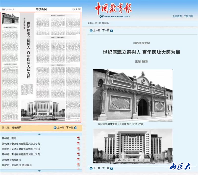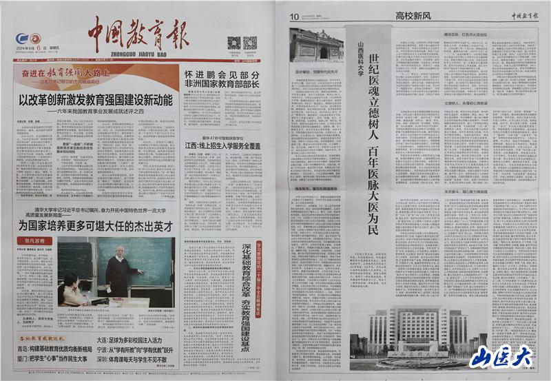 9月6日,《中國教育報》整版刊發我校黨委書記王軍、校長解軍的署名文章《世紀醫魂立德樹人 百年醫脈大醫為民》。文章分“醫府肇始,覺醒年代啟先河”“煥發新生,重任在肩強使命”“賡續血脈,紅色淬火堅信仰”“立德樹人,永葆初心育棟梁”“矢志奮斗,凝心聚力鑄輝煌”五個部分,全面回顧總結了c7c7.app從建校到奮進新時代105年來的光輝歷程,展現了在新時代新征程上學校堅持以習近平新時代中國特色社會主義思想為指導推進高質量發展的生動實踐。