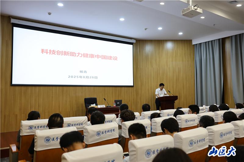 楊青長(zhǎng)期投身于衛(wèi)生健康科技教育事業(yè),在國(guó)家衛(wèi)生科技政策規(guī)劃、醫(yī)學(xué)教育改革、重大科研項(xiàng)目攻關(guān)和生物安全治理等方面具備深厚的理論素養(yǎng)與豐富的實(shí)踐經(jīng)驗(yàn),曾深入?yún)⑴c多項(xiàng)國(guó)家重大醫(yī)學(xué)科技發(fā)展規(guī)劃與政策的制定與實(shí)施,為我國(guó)衛(wèi)生健康科技教育事業(yè)發(fā)展作出了重要貢獻(xiàn)。講座中,楊青結(jié)合自身經(jīng)驗(yàn)和行業(yè)實(shí)際,系統(tǒng)闡述了科技創(chuàng)新在健康中國(guó)建設(shè)中的戰(zhàn)略?xún)r(jià)值,深入剖析了當(dāng)前衛(wèi)生健康領(lǐng)域科技創(chuàng)新面臨的機(jī)遇與挑戰(zhàn),并從完善科技政策體系、促進(jìn)“政產(chǎn)學(xué)研用”深度融合、加強(qiáng)科研人才隊(duì)伍建設(shè)、筑牢生物安全防線等多個(gè)方面,分享了推動(dòng)衛(wèi)生健康科技創(chuàng)新的思路與方向。作為我校資深校友,他還深情表達(dá)了對(duì)母校的深厚情誼,鼓勵(lì)學(xué)校持續(xù)發(fā)揮醫(yī)學(xué)教育與科研優(yōu)勢(shì),為衛(wèi)生健康事業(yè)和健康中國(guó)建設(shè)貢獻(xiàn)更多“山醫(yī)智慧”。