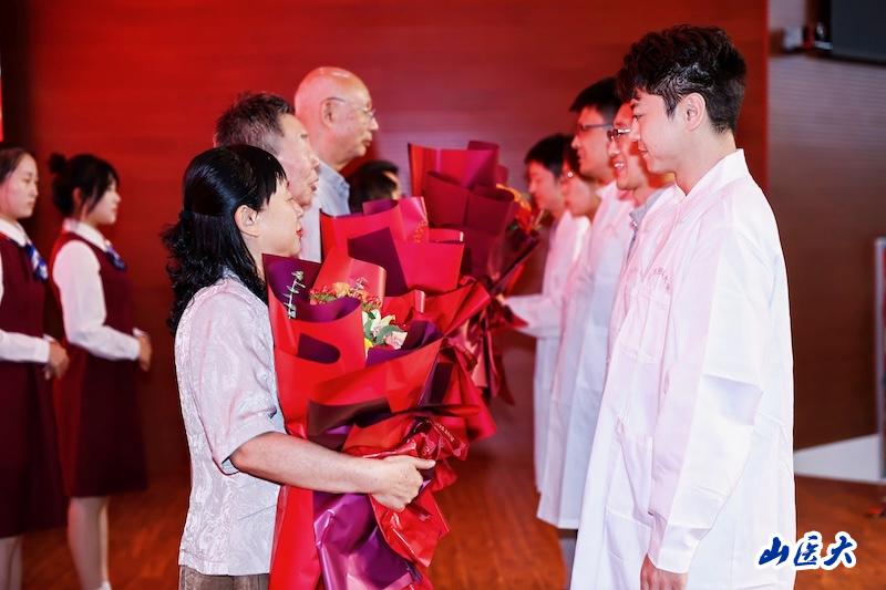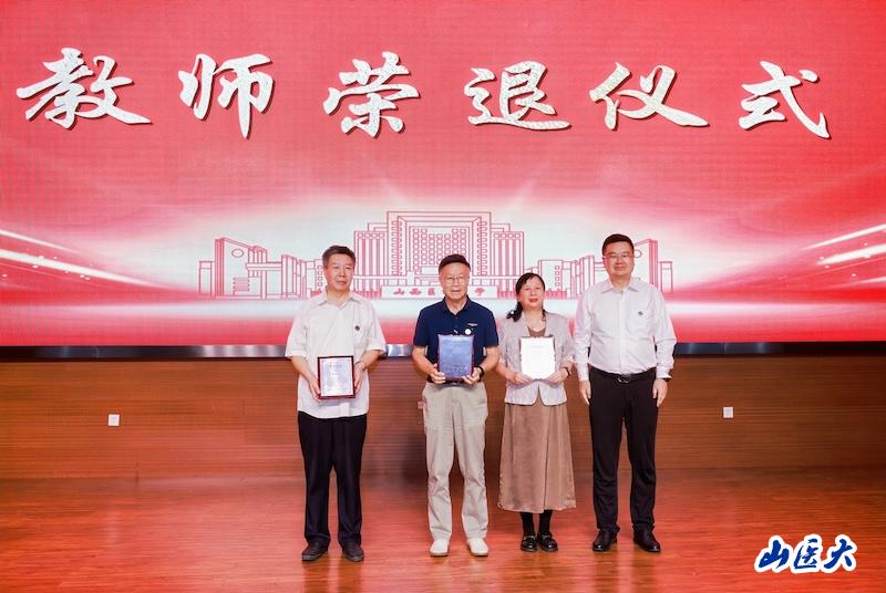 教師榮退儀式和師德傳承儀式上,解軍為榮退教師代表頒發(fā)證書,感謝一批批老教師、老同志多年來恪盡職守、甘為人梯,將最美的年華獻(xiàn)給了黨的教育事業(yè)和山醫(yī)的發(fā)展。青年教師為老教師贈(zèng)送鮮花,老教師為青年教師佩戴校徽,互贈(zèng)祝福。師道承傳,青藍(lán)同心,山醫(yī)事業(yè)在改革奮進(jìn)中開啟新的篇章。