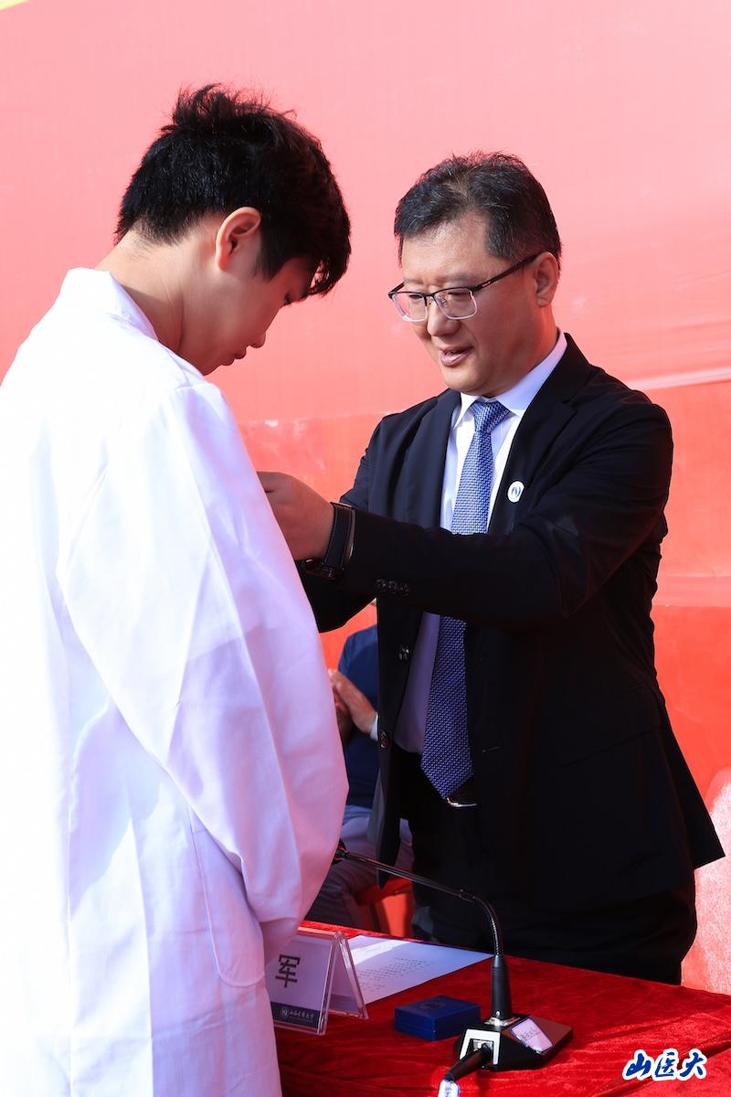 校徽承載著山醫(yī)的榮耀與使命,蘊(yùn)含著深深的祝福與殷切的希望。校領(lǐng)導(dǎo)、嘉賓們?yōu)?025級(jí)新生代表佩戴校徽,點(diǎn)燃同學(xué)們心中的歸屬感與自豪感。全體新生與思想政治輔導(dǎo)員相互致禮。這一儀式不僅是禮貌的表達(dá)和文化的傳承,更是師生情誼的真誠(chéng)交融。