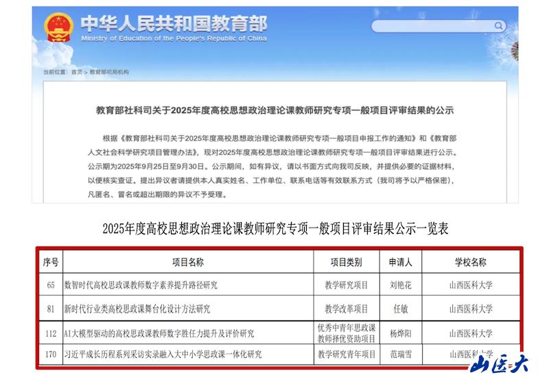 近日,教育部社科司公示了2025年度高校思想政治理論課教師研究專項一般項目評審結(jié)果。本年度該專項共批準(zhǔn)立項198項,涉及175所院校。我校馬克思主義學(xué)院教師劉艷花、任敏、楊燁陽、范瑞雪分別獲批4個不同類別項目,實現(xiàn)了“高校思政課教學(xué)研究項目”“高校思政課教學(xué)改革項目”“高校優(yōu)秀中青年思政課教師擇優(yōu)資助項目”“高校思政課教學(xué)研究青年項目”四個類別的立項全覆蓋,我校成為該專項全國立項最多的單位。