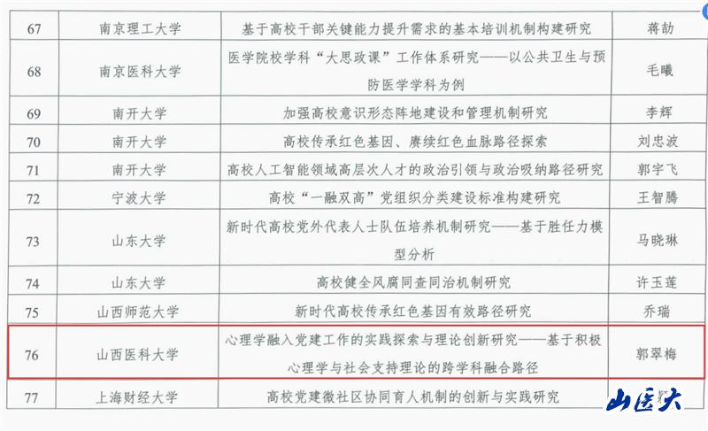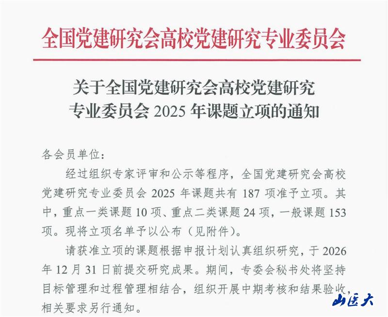 近日,全國黨建研究會高校黨建研究專業(yè)委員會公布了2025年課題立項結(jié)果。經(jīng)專家評審與公示,全國260余所高校申報的1000余項課題中187項獲批,包括重點課題34項(含一類10項、二類24項)和一般課題153項。我校護(hù)理學(xué)院學(xué)生第三黨支部書記、明德潤心輔導(dǎo)員工作室負(fù)責(zé)人郭翠梅主持申報的課題《心理學(xué)融入黨建工作的實踐探索與理論創(chuàng)新研究——基于積極心理學(xué)與社會支持理論的跨學(xué)科融合路徑》獲批立項,為我省高校本次獲批的兩項課題之一。