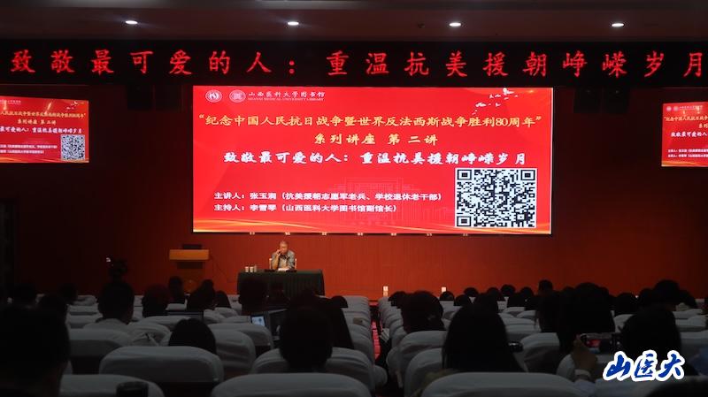 講座中,張玉潤老師以戰爭親歷者的視角為錨點,結合真實歷史脈絡,深情講述了中國人民志愿軍在極端艱苦條件下保家衛國、浴血奮戰的壯闊史詩,深刻詮釋了戰爭背后凝聚的家國情懷與英雄氣概。張玉潤老師強調,重溫這段鐫刻著犧牲與榮光的歷史,不僅是緬懷先烈,更是汲取一種忠誠報國、敢打必勝、眾志成城的精神力量。李雪琴副館長在總結中鼓勵同學們要把老兵的故事、先輩的精神,轉化為鉆研醫學知識、提升專業能力的動力,讓英雄精神在新時代繼續閃耀光芒。