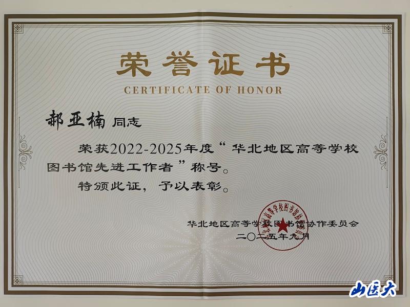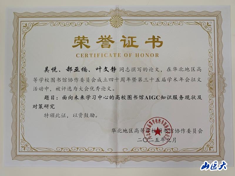 會上,我校圖書館榮獲“華北地區高等學校圖書館2022-2025年度先進集體”。館員尚慧、郝亞楠榮獲“華北地區高等學校圖書館先進工作者”。館員吳悅的論文《面向未來學習中心的高校圖書館AIGC知識服務現狀及對策研究》榮獲優秀論文獎,并受邀作大會交流發言。吳悅在交流發言中提出要新時代圖書館應以未來學習中心為創新載體,探索智慧服務全新路徑,推動圖書館服務范式轉變與創新能力提升的思路,受到與會代表的廣泛認同和關注。
