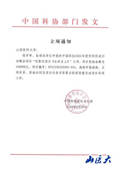近日,2022年中國科協學風傳承行動精品項目立項名單與通知發布,由教務處張軒萍教授牽頭申報的電影紀錄片《生命至上》項目(項目編號:XFCC2022ZZ001-056)獲得立項。