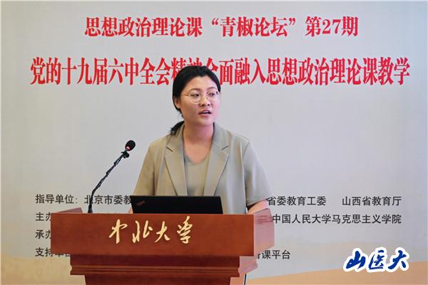 為了更好地推動學習貫徹黨的十九屆六中全會精神工作不斷往深里走、往實里走、往心里走,引導廣大思政課教師將黨的十九屆六中全會精神科學準確地融入思政課教學活動全過程,7月27日,第27期全國思想政治理論課“青椒論壇”在中北大學舉行,來自北京、山西的六位優(yōu)秀青年教師和兩位名師,圍繞“黨的十九屆六中全會精神全面融入思想政治理論課教學”進行了教學展示和名師分享。馬克思主義學院院長蘇果云教授和青年教師孫英博士參加了此次論壇。