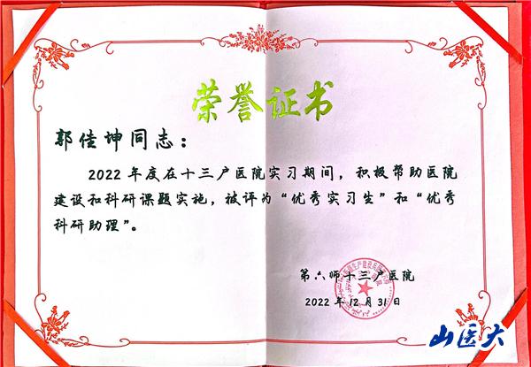 郭佳坤同學以兢兢業業的工作態度,不求回報的奉獻精神,展現了山醫人的良好精神風貌和工作擔當,得到了群眾的一致好評。