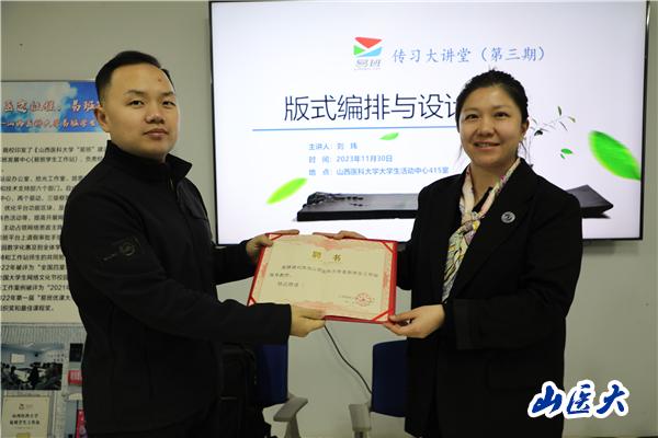 為進(jìn)一步提高易班學(xué)生工作站成員的文章編排、圖片設(shè)計、視頻制作等能力,創(chuàng)作出更優(yōu)秀的網(wǎng)絡(luò)文化作品,推動我校網(wǎng)絡(luò)育人工作的進(jìn)一步發(fā)展,學(xué)生工作部特聘請劉瑋為易班學(xué)生工作站指導(dǎo)教師,楊潔為其頒發(fā)聘書。