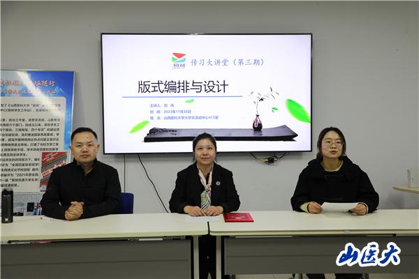 11月30日晚,學(xué)生工作部易班學(xué)生工作站在中都校區(qū)大學(xué)生活動中心415室舉辦了第三期“傳習(xí)大講堂”——版式編排與設(shè)計。培訓(xùn)由山西應(yīng)用科技學(xué)院副教授劉瑋主講,學(xué)生工作部副部長楊潔出席,易班學(xué)生工作站指導(dǎo)老師王玉男主持,易班學(xué)生工作站成員參加培訓(xùn)。