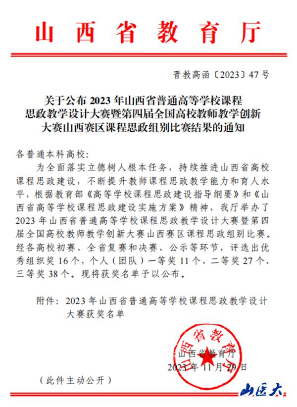 山西省普通高等學?緯趟頰教學設計大賽是由山西省教育廳主辦,山西省高?緯趟頰建設聯盟承辦。大賽旨在深入落實立德樹人根本任務,大力推進高?緯趟頰建設,持續深化高校教育教學改革,發揮課堂育人主陣地作用。經各高校初賽、省級復賽、決賽和冠亞軍爭奪賽等程序,共評選出一等獎11個、二等獎27個、三等獎38個。