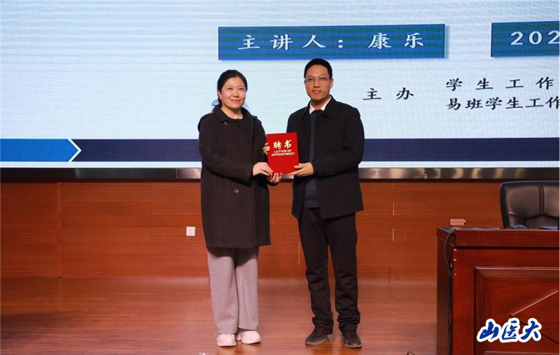 講座開始前,學生工作部聘請康樂為易班學生工作站指導教師,楊潔為其頒發了聘書。