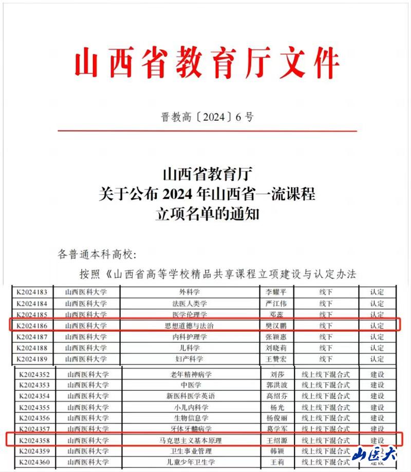 近日,山西省教育廳公布了2024年山西省一流課程評選結(jié)果,我?!八枷氲赖屡c法治”和“馬克思主義基本原理”兩門課程獲批省級精品課程。至此,加上我校馬克思主義學(xué)院之前獲批的2門國家級一流本科思政課程、3門山西省一流課程,我校實現(xiàn)了本科思政課省級以上精品課程的全覆蓋。