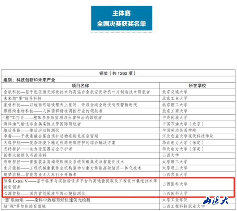 我校第二臨床醫(yī)學(xué)院《智囊Extral V——基于臨床與實(shí)驗(yàn)驗(yàn)證多平臺(tái)的高通量提取及工程化外囊泡技術(shù)革新引領(lǐng)者》團(tuán)隊(duì)和管理學(xué)院《心源智檢——國內(nèi)首創(chuàng)尿液早篩心梗檢測儀》團(tuán)隊(duì)喜獲科技創(chuàng)新和未來產(chǎn)業(yè)組別銅獎(jiǎng),法醫(yī)學(xué)院《大國重器-中國“智”造法醫(yī)身份鑒識(shí)系統(tǒng)》團(tuán)隊(duì)和《毒易檢——開創(chuàng)毒品快速精準(zhǔn)檢測新時(shí)代》團(tuán)隊(duì)喜獲社會(huì)治理和公共服務(wù)組別銅獎(jiǎng)。