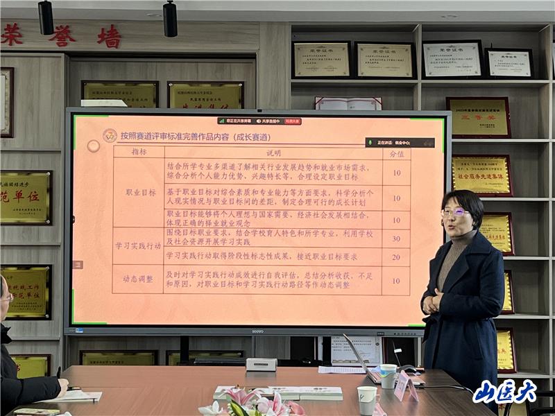 作為山西省高校就業創業指導師資庫成員,李紅霞老師以“筑夢青春,規劃未來”為主題,結合自身工作,分享了一系列輔導員在大學生職業規劃和就業指導工作中的方法和經驗,并以首屆大學生職業規劃大賽中的優秀案例和其取得的優異成績為樣本,詳細闡述了輔導員在大學生職業規劃大賽中所扮演的重要角色,以及如何通過科學的指導和有效的輔導,幫助學生提升職業規劃能力,增強就業競爭力。同時,她建議輔導員要深入了解學生的專業背景、興趣愛好和職業規劃目標,幫助學生明確個人定位,制定科學合理的職業規劃方案,還要注重培養學生的創新思維和實踐能力,鼓勵學生積極參加各類社會實踐和志愿服務活動,豐富自己的社會經驗和人生閱歷。