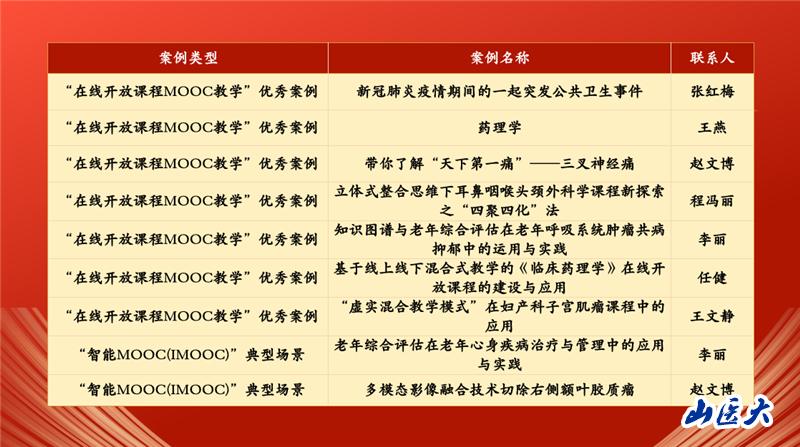 12月22日,第五屆全國慕課教育創新大會在青島召開,作為執委會聯盟成員單位之一,我校代表晉課聯盟參加了本次會議。大會就慕課創新應用引領數字教育改革、智慧慕課建設成果、AI技術驅動高?緯探萄Ц母锎蔥、產教融合新形態課程建設成果等展開了專題報告。會議公布了“在線開放課程MOOC教學”優秀案例和“智能MOOC(IMOOC)”典型場景,我校選送的《知識圖譜與老年綜合評估在老年呼吸系統腫瘤共病抑郁中的運用與實踐》和《“虛實混合教學模式”在婦產科子宮肌瘤課程中的應用》等9部作品分別被評為優秀案例和典型場景。