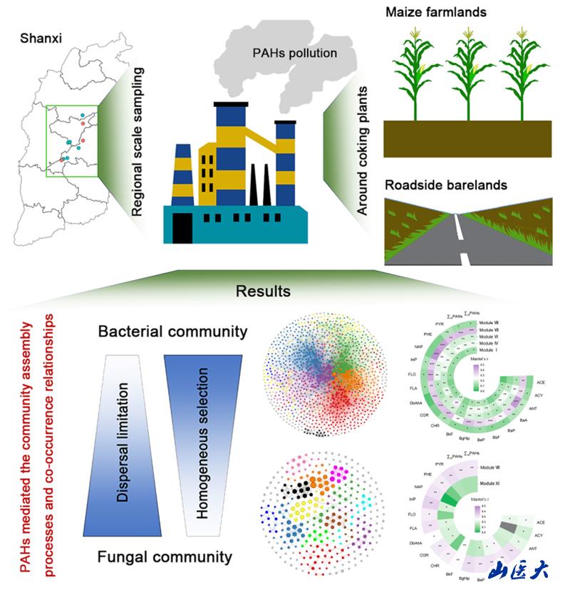 研究通過對山西省中部地區(qū)9個焦化廠(其中3個經(jīng)過產(chǎn)業(yè)調(diào)整升級已全面關(guān)停)附近土壤樣地進行了調(diào)查研究,研究結(jié)果顯示經(jīng)過產(chǎn)業(yè)調(diào)整升級全面關(guān)停的焦化廠附近土壤多環(huán)芳烴污染程度顯著較低,表明我省焦化行業(yè)調(diào)整升級已初顯成效,生態(tài)環(huán)境質(zhì)量改善明顯。研究進一步評估多環(huán)芳烴污染對土壤細菌和真菌群落構(gòu)建和多樣性維持機制的影響,結(jié)果表明相比于土壤真菌,多環(huán)芳烴對土壤細菌群落多樣性和共發(fā)生網(wǎng)絡(luò)的影響更大。在研究區(qū)域內(nèi),確定性過程(主要是均質(zhì)性選擇)主導(dǎo)細菌的群落構(gòu)建,隨機性過程(主要是擴散限制)主導(dǎo)真菌的群落構(gòu)建,揭示了不同類型微生物對多環(huán)芳烴污染的敏感程度的差異及應(yīng)對污染的不同組裝策略。研究篩選出一系列與多環(huán)芳烴降解相關(guān)的微生物標(biāo)記物,包括Sphingobium、 Gemmatimonas、Fusarium、Verticillium、Humicola和 Didymella等,基于這些標(biāo)記物結(jié)合機器學(xué)習(xí)算法成功構(gòu)建了土壤多環(huán)芳烴污染程度評估模型,模型具有較高的準(zhǔn)確性,表明了微生物作為環(huán)境法醫(yī)指示物種進行污染物診斷和評估的巨大潛力。