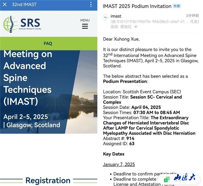 近日,第32屆IMAST會議(國際脊柱先進(jìn)技術(shù)會議)學(xué)術(shù)論文評選結(jié)果出爐,我校第二醫(yī)院骨科脊柱畸形專業(yè)組薛旭紅教授的1篇研究性學(xué)術(shù)論文入。苧贗MAST會議上作大會發(fā)言。