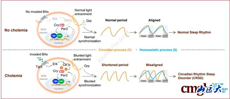 睡眠紊亂一直是困擾慢性肝病患者的一個重要臨床問題,低質(zhì)量睡眠不僅使患者生活質(zhì)量下降,還可加重病情進(jìn)展,從而陷入惡性循環(huán)的怪圈。研究團(tuán)隊通過對不同慢性肝病病人睡眠-運動日節(jié)律的監(jiān)測,發(fā)現(xiàn)高膽血癥是擾亂慢性肝病患者睡眠紊亂的重要誘發(fā)因子,與無高膽血癥的慢性肝病患者相比,有高膽血癥的慢性肝病患者的睡眠質(zhì)量明顯降低,且這一現(xiàn)象與慢性肝病的種類無明顯關(guān)系。該研究進(jìn)一步運用高膽血癥小鼠模型證明血液中超標(biāo)的膽酸可通過血腦屏障侵入下丘腦的視交叉上核(SCN),激活了SCN神經(jīng)元上的膽酸受體TGR5,通過TGR5-ERK-CK1ε通路增加了核心生物鐘蛋白PER2的磷酸化水平,Per2磷酸化促使其在胞漿內(nèi)大量聚集難以入核,從而促進(jìn)了受其轉(zhuǎn)錄抑制的鐘基因的表達(dá),并加快了機(jī)體內(nèi)源性振蕩周期;另一方面,高膽血癥還減弱了SCN內(nèi)DRP能神經(jīng)元對光照導(dǎo)引作用的響應(yīng),從而使機(jī)體縮短的內(nèi)源性周期難以適應(yīng)外界24小時的晝夜更迭,進(jìn)一步加重睡眠節(jié)律紊亂,降低睡眠質(zhì)量。