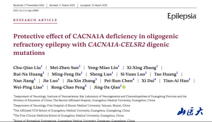 近日,我校第一醫(yī)院神經(jīng)內(nèi)科孫美珍教授與廣東醫(yī)科大學(xué)劉楚翹博士、彭榮超教授和廣州醫(yī)科大學(xué)附屬第二醫(yī)院神經(jīng)內(nèi)科廖衛(wèi)平教授、喬景達博士合作完成了一項關(guān)于癲癇基因相互作用及其在藥物難治性癲癇的保護機理研究。該研究在國際期刊《Epilepsia》發(fā)表(中國科學(xué)院1區(qū),影響因子6.6):Protective effect of CACNA1A deficiency in oligogenic refractory epilepsy with CACNA1A-CELSR2 digenic mutations。該研究聚焦一例同時攜帶CACNA1A和CELSR2兩個罕見基因變異的藥物難治性癲癇病例,利用果蠅模型構(gòu)建多基因突變模型,結(jié)合邏輯回歸分析,鈣成像技術(shù),藥物和基因治療技術(shù),發(fā)現(xiàn)癲癇致病基因CACNA1A在不同遺傳背景下具有致病/抗癲癇的多重作用,揭示了CACNA1A和CELSR2基因在癲癇發(fā)病中的交互作用,為認識寡基因背景下的藥物難治性癲癇的發(fā)病機理提供了新思路,為其精準(zhǔn)治療帶來新的治愈希望。