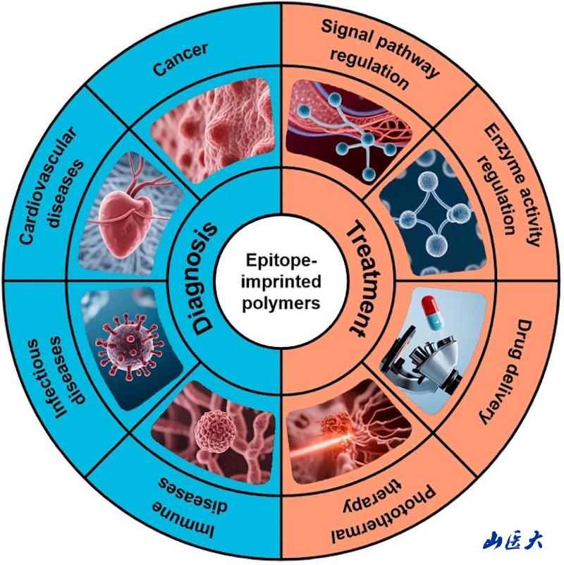 表位印跡聚合物(EIPs)是以蛋白質的一小段特征肽段作為表位替代完整蛋白進行印跡,從而確保了表位的結構特異性能夠代表完整蛋白,避免了使用完整蛋白作為模板時存在的來源受限、構象不穩定等問題。近年來,EIPs在疾病診斷與治療領域中的應用受到越來越多的關注。本論文綜述了EIPs在上述領域中的最新研究進展。根據表位模板的數量和結構特征對表位印跡策略進行分類,并詳細討論了單表位印跡、雙表位印:凸瓜蟊砦揮〖2唄。重點總結了EIPs在癌癥、心血管疾病、傳染病和免疫性疾病等疾病診斷中的應用,以及在調節信號通路、調控酶活性、藥物靶向遞送和光熱治療等治療策略中的應用。簡要探討了EIPs在疾病診斷和治療中面臨的挑戰與未來發展前景。
