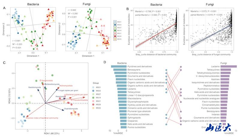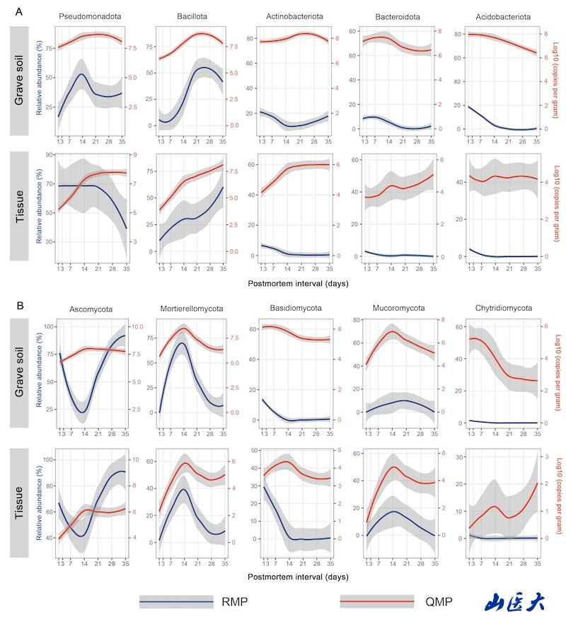 動物尸體分解腐敗在地球元素循環中發揮重要作用,研究尸體腐敗過程中的微生物演替對深入了解這一進程至關重要。另外,微生物群落演替可用于法醫領域死亡時間的推斷(PMI)。目前,對尸體微生物的表征多基于擴增子高通量測序技術,該技術僅能對微生物組成和豐度進行相對定量,忽視了微生物載量變化。嚴江偉教授團隊首次采用微生物絕對定量技術(QMP)對大鼠尸體細菌和真菌群落進行研究。結果顯示,幾個主要菌門(Pseudomonadota、Actinobacteriota、Bacteroidota、Ascomycota和Basidiomycota)的絕對豐度表現出與相對豐度截然不同甚至相反的變化趨勢,表明相對定量技術在表征群落演替時存在偏差,容易忽略某些微生物類群在腐敗進程中發揮的作用。