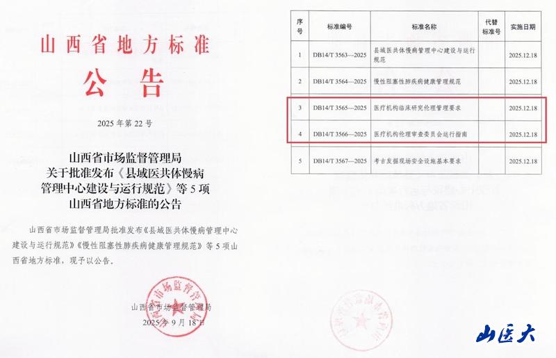 近日,《醫(yī)療機構臨床研究倫理管理要求》(DB14/T 3565-2025)、《醫(yī)療機構倫理審查委員會運行指南》(DB14/T 3566-2025)經(jīng)過歷時一年的現(xiàn)場倫理審查、資料收集與調研、標準起草、意見征求和省衛(wèi)生健康標準化技術委員會審查評議后,由省市場監(jiān)督管理局發(fā)布。我校人文社會科學學院鄧蕊教授分別擔任兩項地方標準的第一牽頭人和第三牽頭人。