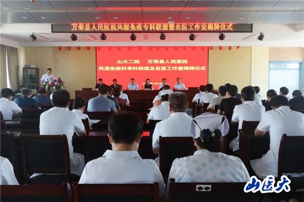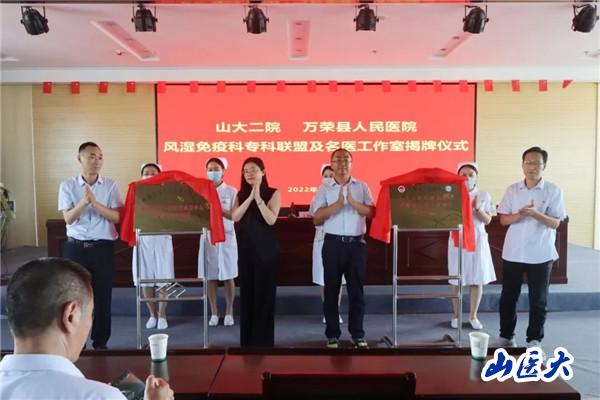 8月6日,由第二醫院風濕免疫科主任王彩虹帶隊的風濕病專家團隊來到萬榮縣人民醫院,參加在縣醫院門診八樓學術報告廳舉行的“萬榮縣人民醫院與第二醫院風濕免疫科專科聯盟”揭牌儀式。這標志著風濕免疫科開展的縣域醫共體專科聯盟又增加了新的成員,至此萬榮縣人民醫院正式成為“山西風濕專科聯盟成員單位”“第二醫院風濕免疫科王彩虹主任專家團隊名醫工作室”。