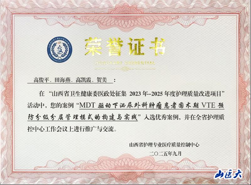 由高俊平帶領的泌尿外科護理團隊,聚焦泌尿外科腫瘤患者圍術期靜脈血栓栓塞癥(VTE)的防控難題,創新建立“MDT驅動下分級分層管理模式”。該模式打破學科界限,整合外科、麻醉、藥學、康復、營養等多學科資源,依據患者不同風險等級實施個性化防控策略,實現了VTE防治的精準化與全流程管理,為復雜腫瘤患者圍術期安全提供堅實保障,其創新理念和實用成效為全省醫療機構提供了可復制、可推廣的實踐范本。