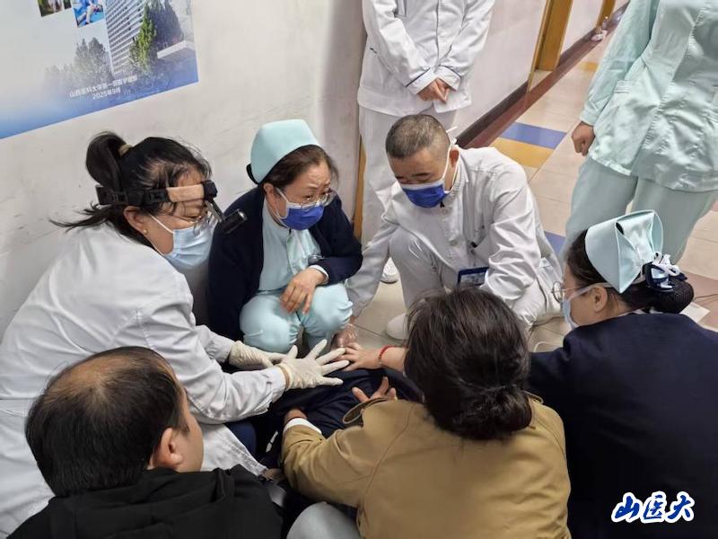 一位五十多歲的中年男性被120工作人員緊急推入急診醫學中心綜合診室,他面色發紺、呼吸困難,雙手緊緊抓著喉嚨。一場與死神的賽跑在走廊上驟然開始。此時急診室內擠滿了候診患者,轉運平車一時難以通行。時間就是生命,一秒都不能耽擱!“讓開通道!”王鳳云老師一聲令下,搶救的節奏瞬間啟動。弓濤護士迅速清空急救區域,推著搶救車、手持氣管插管箱沖在前面;王凱鑫護士跪在地上,一針見血迅速建立靜脈通路;實習護士穩穩舉著照明燈,為耳鼻咽喉——頭頸外科醫生照亮操作視野……