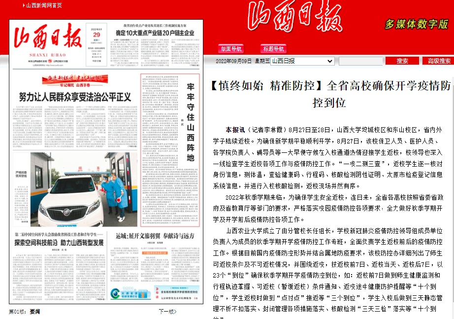 本報訊(記者李林霞)8月27日至28日,山西大學塢城校區和東山校區,省內外學子陸續返校。為確保新學期平穩順利開學,8月27日,該校保衛人員、醫護人員、各學院負責人、輔導員等一大早便守候在入校通道熱情迎接學生返校,校領導也深入一線檢查學生返校各項工作與疫情防控工作。“一核二測三查”,返校學生逐一核對身份信息,測體溫,查驗健康碼、行程碼、核酸檢測陰性證明、太原市檢疫登記信息系統信息,并進行入:慫峒觳,返校現場井然有序。