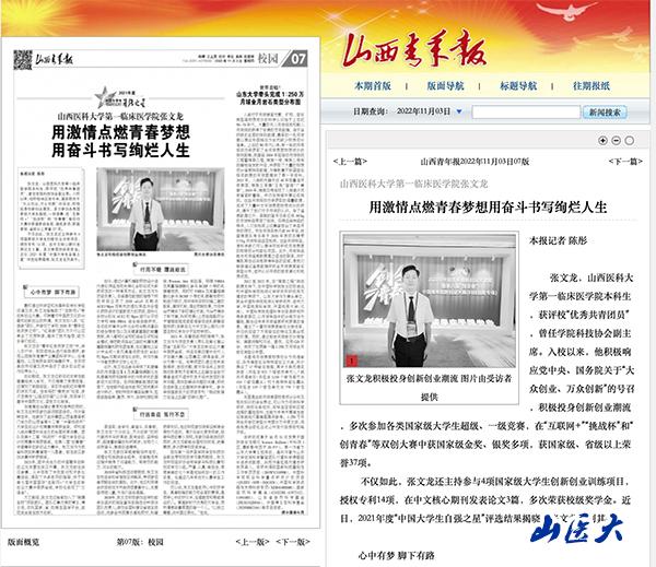 在提高政治理論素質和修養的同時,張文龍還積極參加各項黨團活動。作為答辯選手,他參加了由共青團山西省委等部門主辦的山西省第十二屆 “興晉挑戰杯”大學生創業計劃競賽并榮獲金獎,順利進入由共青團中央主辦的全國終審決賽。團隊在第十二屆 “挑戰杯”中國大學生創業計劃競賽中榮獲銀獎。在第八屆“創青春”中國青年創新創業大賽中,張文龍作為我省科技創新賽道唯一入圍者,前往武漢參加決賽并斬獲銀獎。
